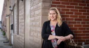 HealthWell grant recipient Crystal standing on the corner of her brick apartment building.