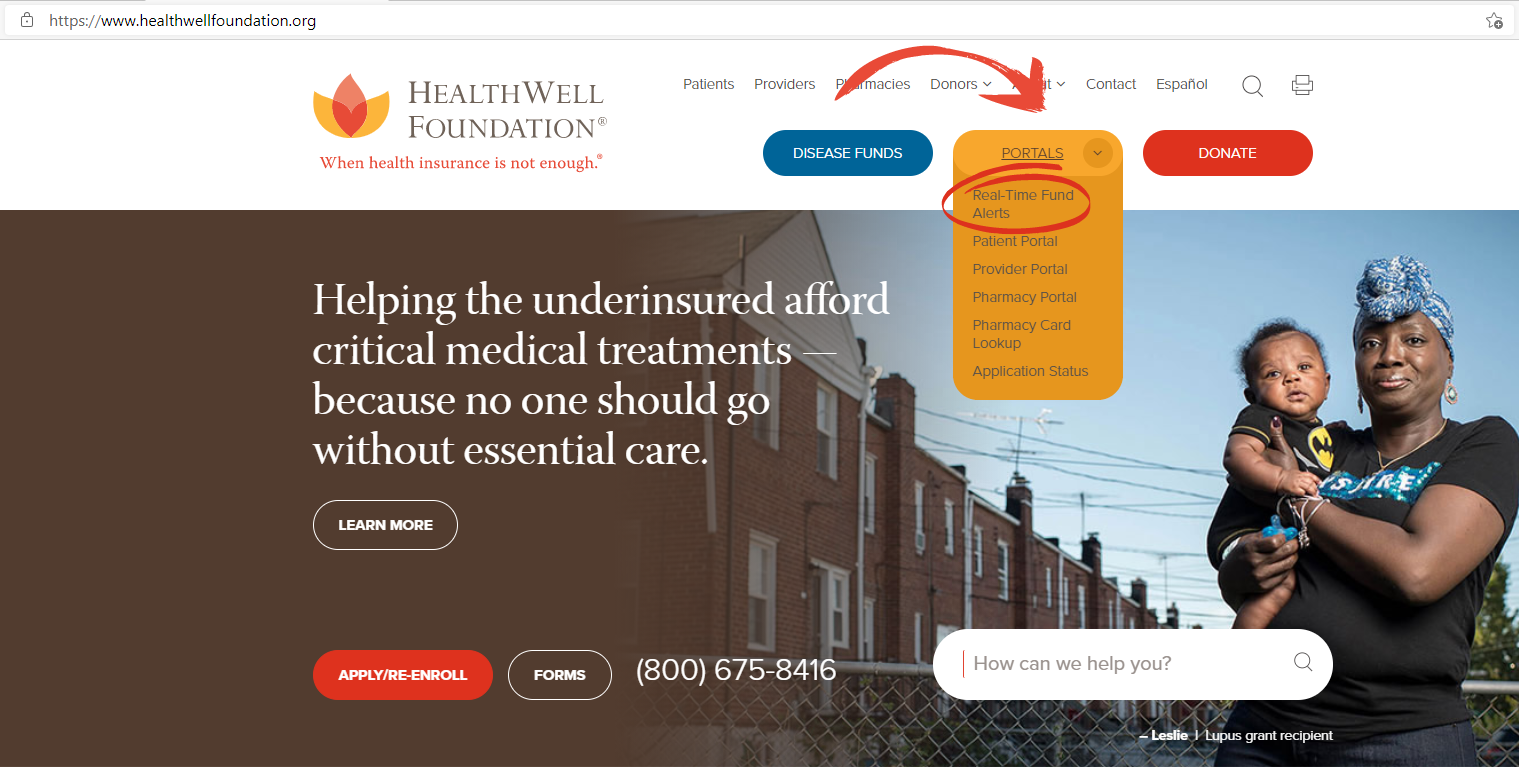 - Simply select Real-Time Fund Alerts from the dropdown Portal button at www.HealthWellFoundation.org.