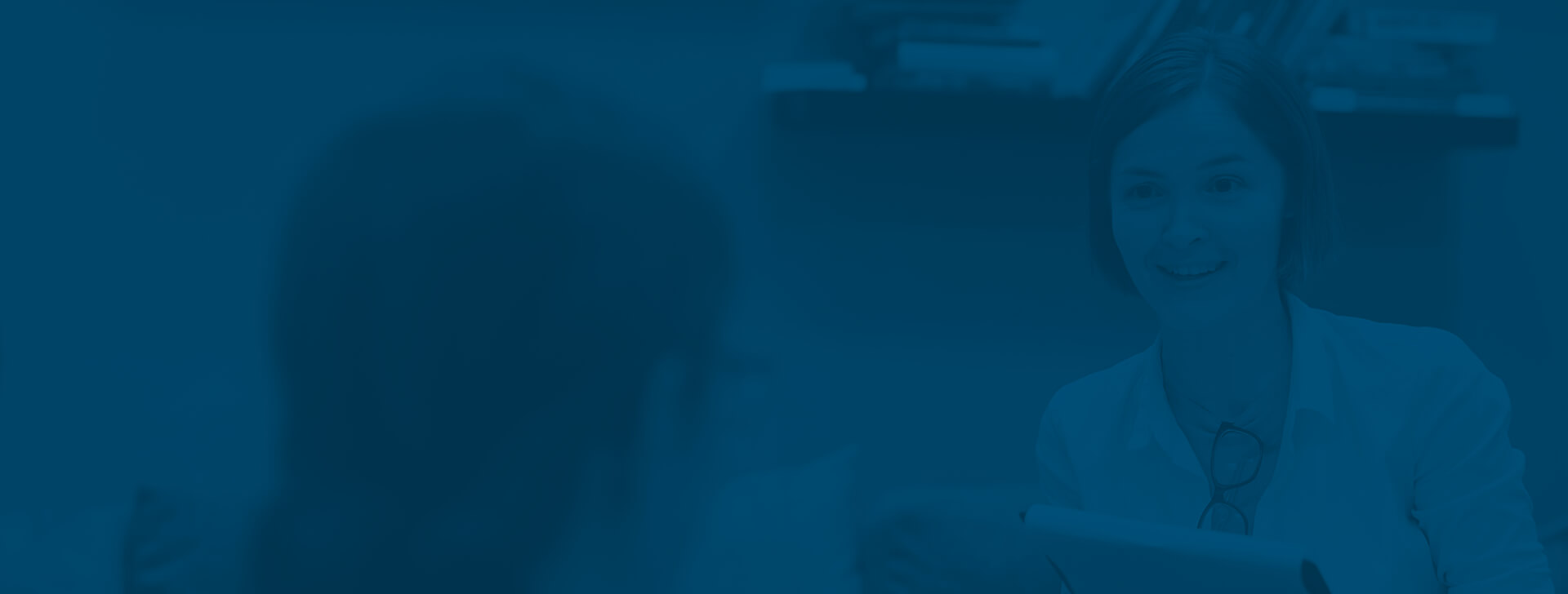 Background with faded image of provider talking with patient.